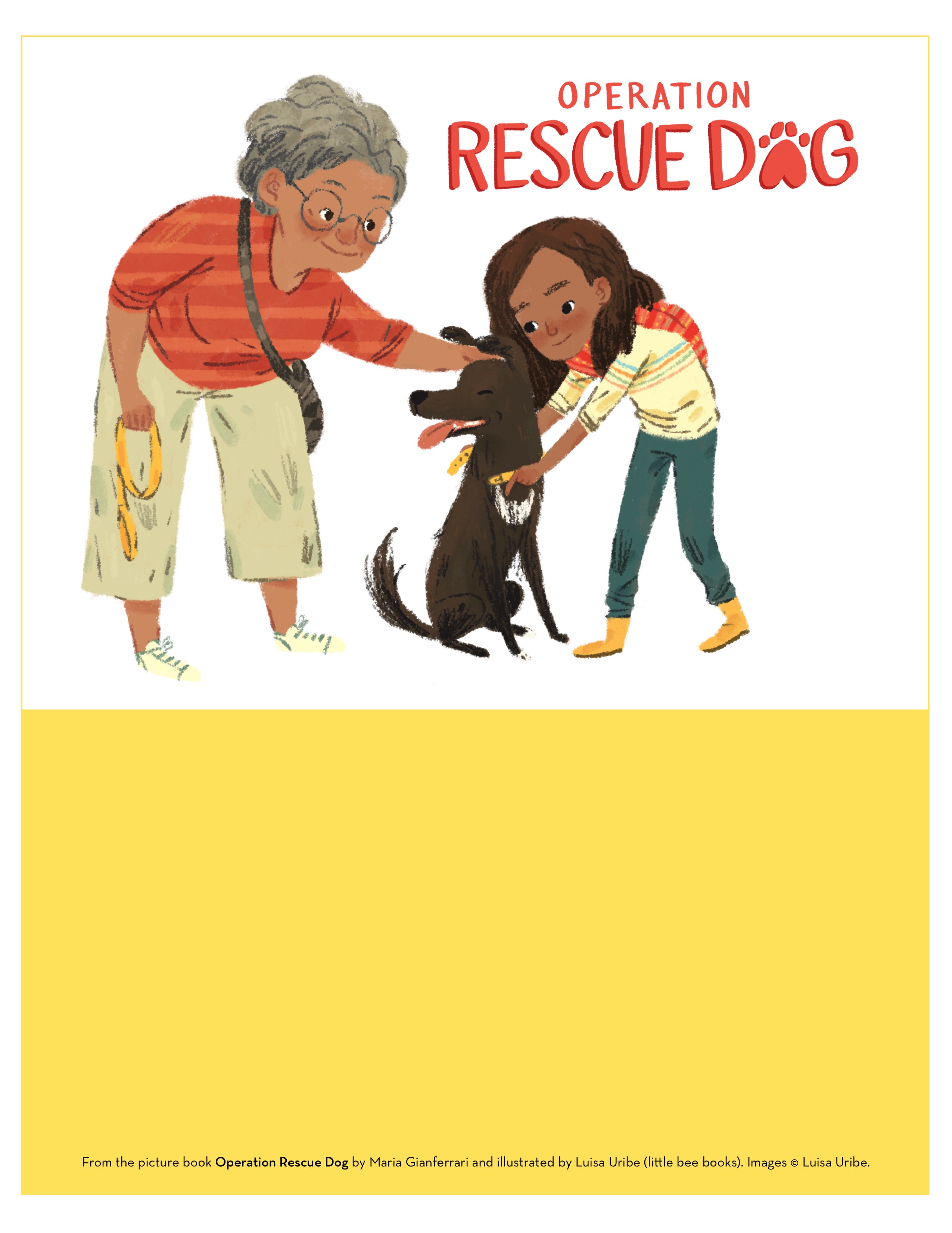 In the picture book Operation Rescue Dog, Alma and her Abuela set off on a journey to meet Lulu, the dog they plan to adopt. Lulu is being driven toward Alma and Abuela in an Operation Rescue Dog truck.